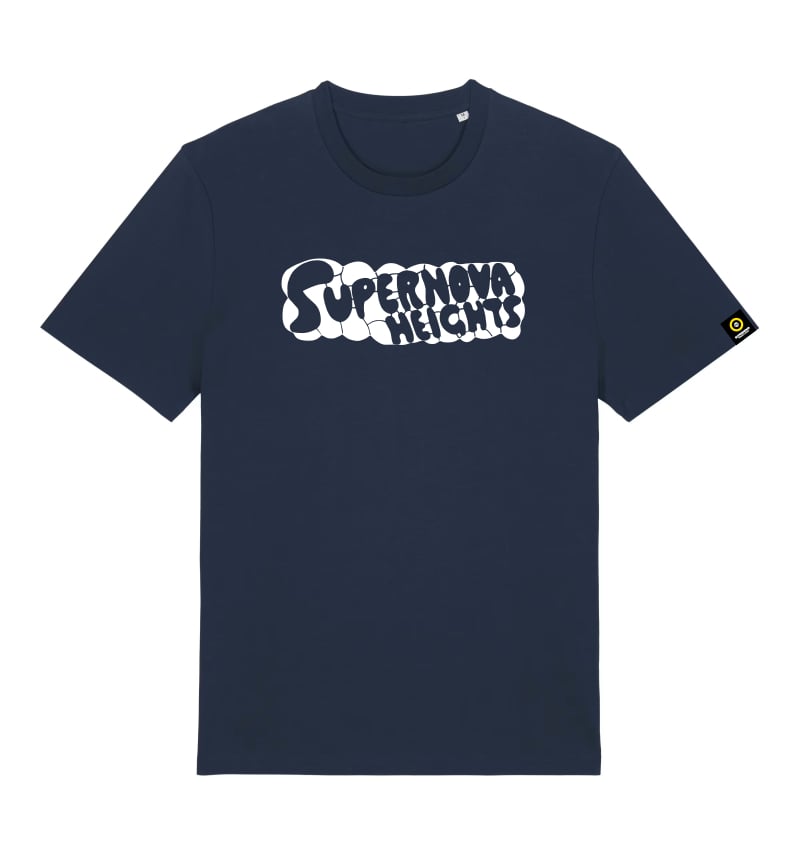 Navy T-Shirt with white Supernova Heights Print on chest & Supernova Mod Sleeve tag.